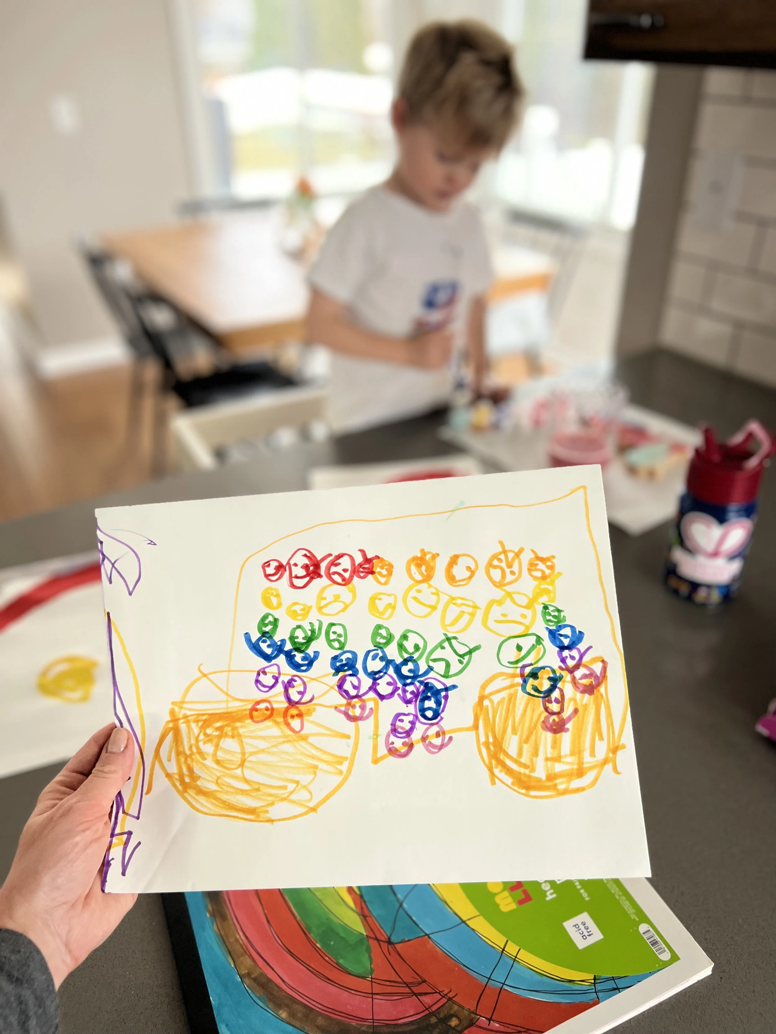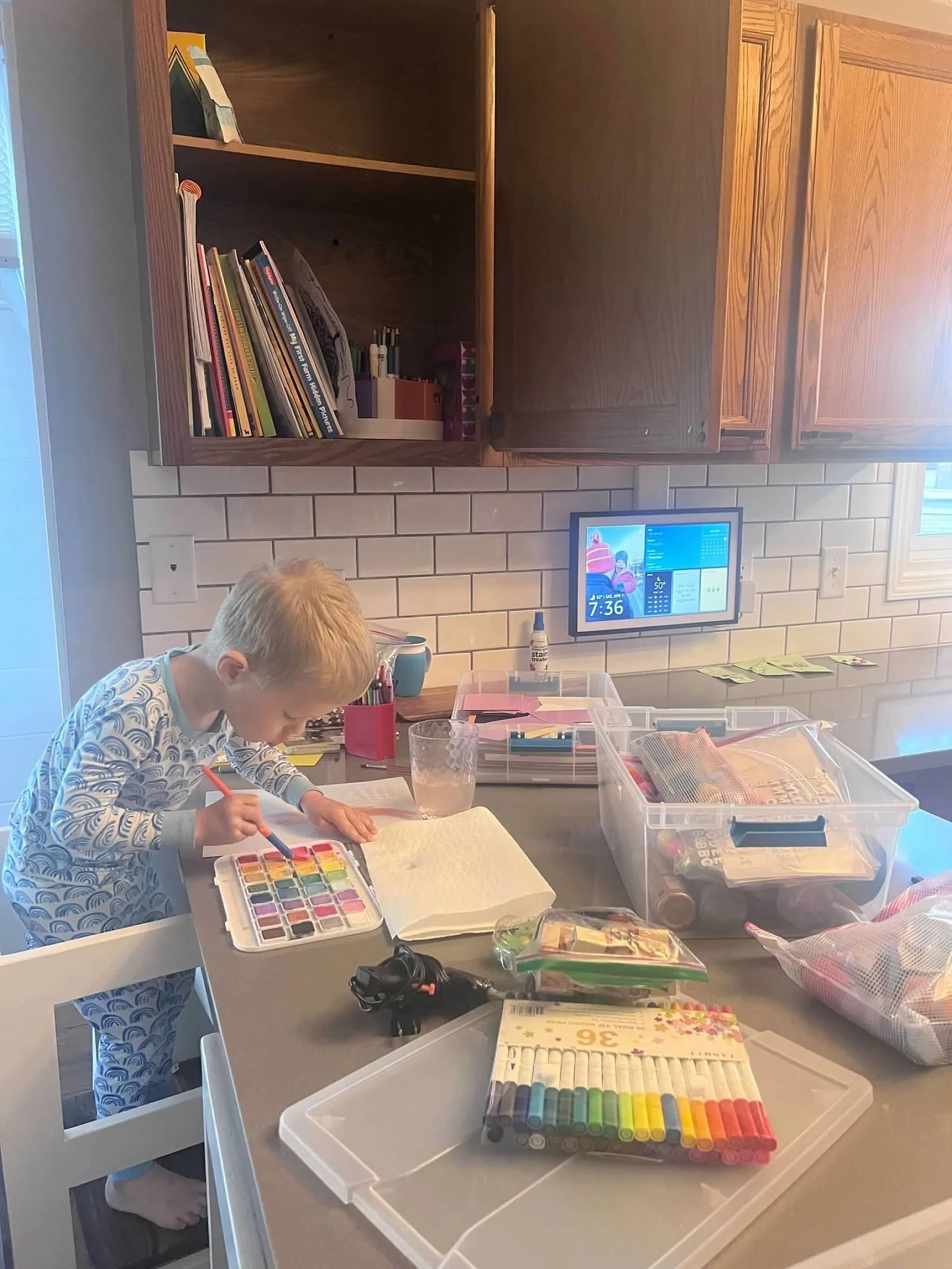 I’m still wrapped up in bed, typing furiously on my laptop, all too aware of the soft “deadline” I have to turn in this week’s essay when I hear Luca’s sound machine turn off, signaling that he is allowed to get out of bed for the day. It’s early, but I hear Luca creep out of his room, walk quietly down the hall, and then down the stairs. I hear the kitchen cabinet containing all our art supplies open. Small bins of crayons and markers and kid scissors are set on the counter. I hear the swish of papers as Luca flips through his sketchbooks.