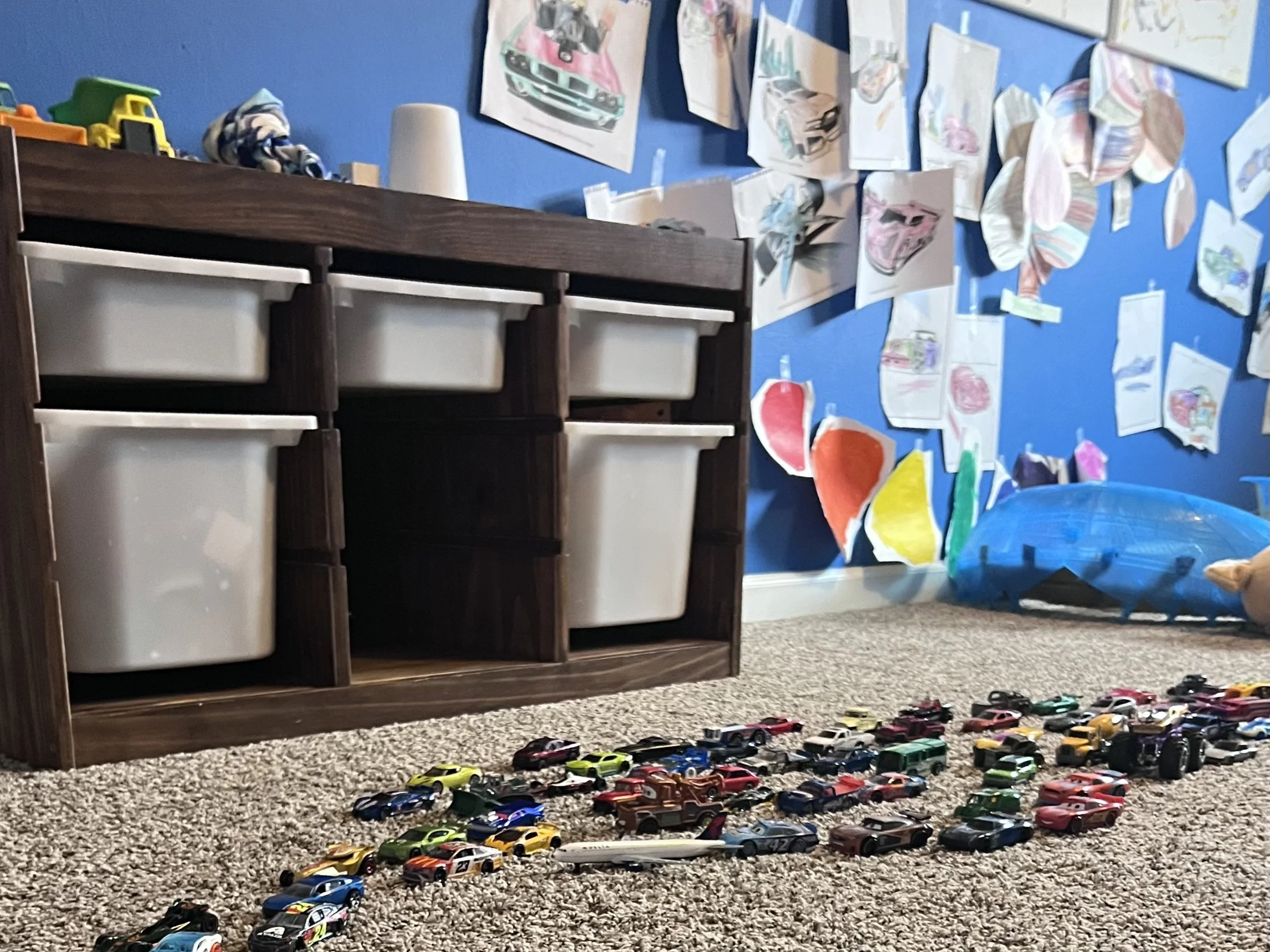 It’s an enormous piece of sheet metal, housed inside a DIY wood frame. There’s a little shelf at the top to contain the various little wooden animals and cars Luca paints on occasion. The rest of the board is for him to display his many works of art. The pictures he tears out of his coloring books, the random scrap pieces of paper he cuts up and calls “leaves, and dozens of sketches of cars, faces, forest scenes, and my very favorite— a “blueberry tree,” all get taped to the art board or hung up with magnets.